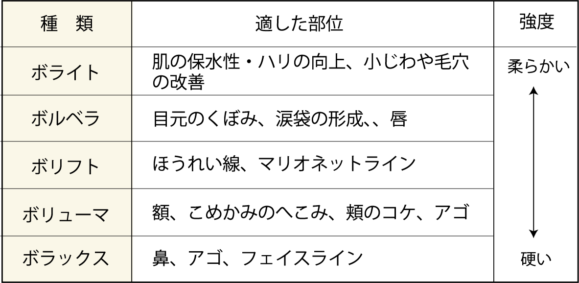 ヒアルロン酸は年齢とともに少しずつ減少していきます。それによって失われた肌のハリやが、顔のしわや凹みなどに対して直接ヒアルロン酸を注入することで、ハリの改善やシワや凹みを目立たなくします。